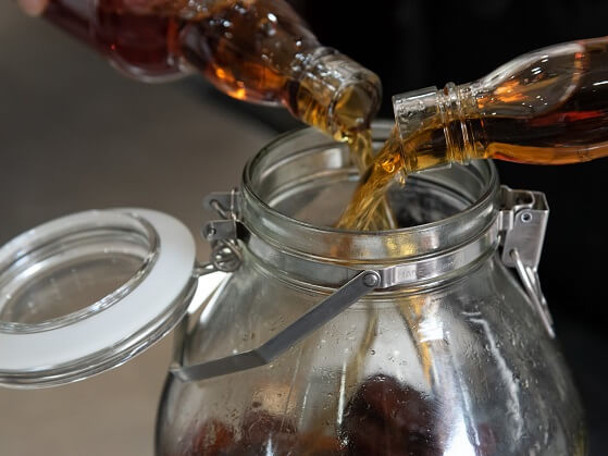 このアプリコットを40度のスパイスドラムで、最低でも半年は熟成させるそうだ。そうすると、フルーツの旨味と甘みが洋酒に溶け出し、その旨味が溶け出した洋酒をフルーツが吸収するという。
