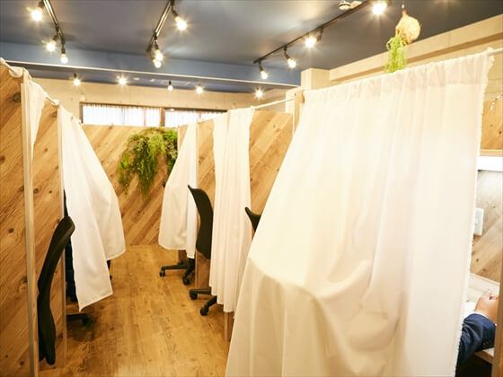 全席で無料Wi-Fiに接続可能なので、インターネットもサクサクつながる! 上部には棚もあり、参考書などを置くのによさそうだ。また、席は並んでいるものの、カーテンを閉めれば自分だけの空間に。