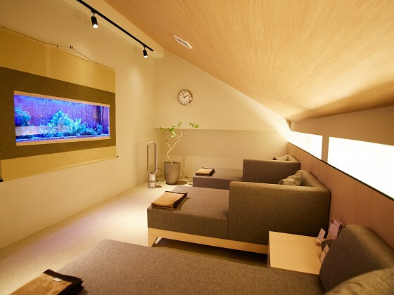 「酵素浴の施設を見て回りましたが、水槽を置いているところはありませんでした。横浜店には、ぜひ水槽を置いて、何も考えずただボーっと癒される空間にしたいと考えました」と、リラックスタイムへのこだわりを語ってくれた。