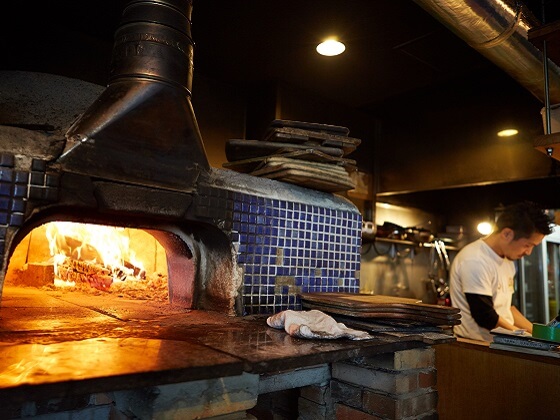 「職人さんが造る窯の3分の1程度の大きさですが、素人の窯としてはかなり良い出来で、開店以来ずっとウチの味を支えてくれています」と若杉さん。「ガスの窯で焼いたものとは大きく違いますね。ガスだとどうしても均一に焼けてしまい個性が出ないのですが、薪による遠赤外線効果で生地がフワッと焼き上がり、へりの部分に絶妙なコゲができるんです」とメリットを話してくれた。