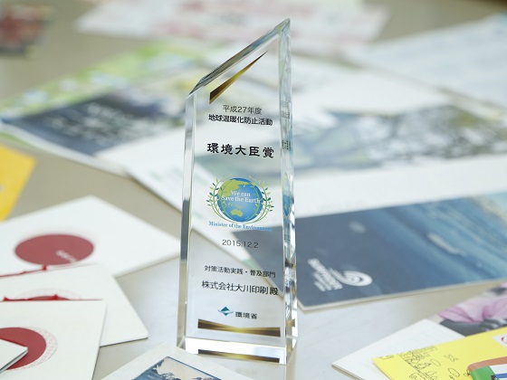 大川印刷は「石油系溶剤0%インキの普及啓発を通じた地球温暖化防止活動」が認められ、2015(平成27)年11月に、環境省から「地球温暖化防止活動環境大臣表彰」を受彰!