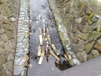 武蔵小杉・法政通りと二ヶ領用水が交差する橋の下に水車が設置され、橋の上に設置されているカエルの人形とつながっている。誰が何のために設置しているのかキニナル。