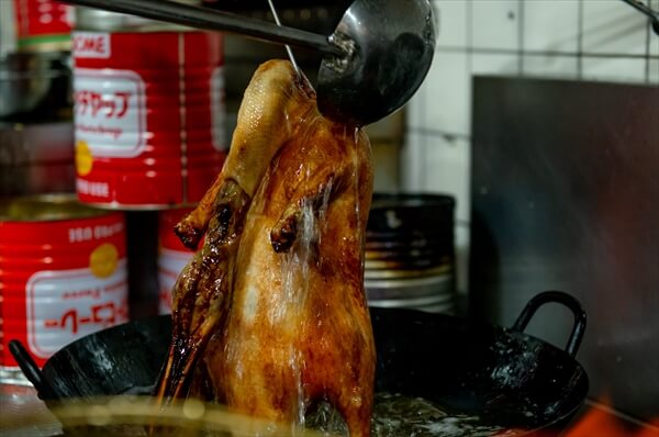 下処理の済んだ北京ダックに高温の油をまんべんなくかけていく
