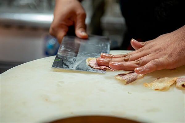 薄皮になるまで脂をしっかり削ぎ落としていく