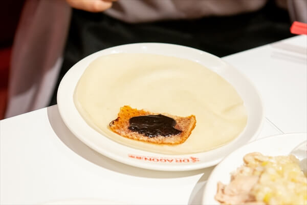 驚きなのが、切り出していく皮の量。聞けば、枚数にしてわずか16枚程だとか。「この大きさの北京ダックから、たった16枚しかとれないの?」と思わず声をあげてしまった取材陣一同。それだけ贅沢な料理ということを改めて実感した。