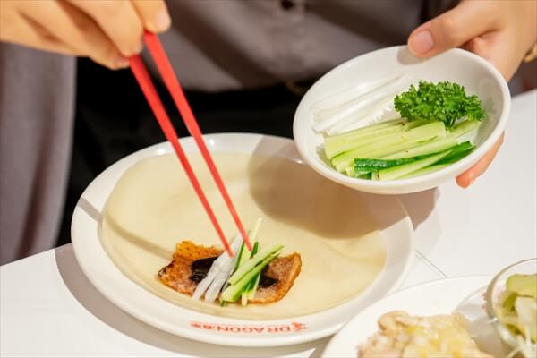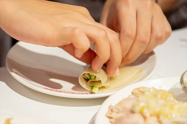 食べ方の定番は、パリパリに焼いた北京ダックの皮を荷叶餅(ホーイエピン)と呼ばれる小麦粉の皮の上に乗せ、長ネギやキュウリをトッピングして甜面醤(テンメンジャン)を添え、最後に巻いて食べるスタイル。北京ダックの皮にはコラーゲンが豊富に含まれているとか。