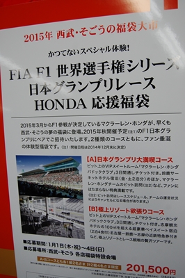 2015年の「体験型福袋」は「F1世界選手権シリーズ日本グランプリレースHONDA応援福袋」。