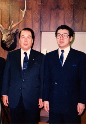大臣室にて、衆議院議員秘書時代の荒井会長(右)