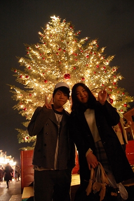 今年で5年目を迎える赤レンガ倉庫のクリスマスマーケットは会場を訪れた人を楽しませている。埼玉県のタカカズさん(左)とマドカさんは「今年初のイルミネーション。会場が全体的にかわいくてすてき」と話していた。