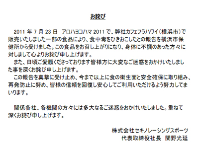 「アロハヨコハマ2011」食中毒事件、カフェフラハワイの対応は?