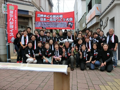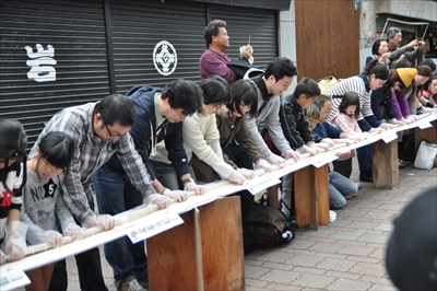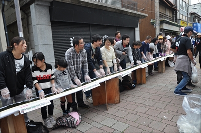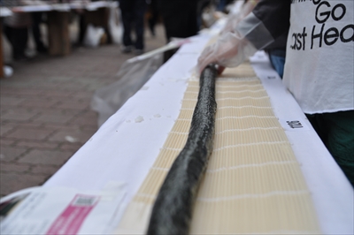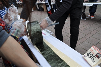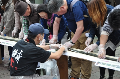今回で9回目、三崎港の「日本一長い鉄火巻き作り」で作られた鉄火巻きの長さは555メートルで日本記録更新後美味しくいただいた。2016年も開催予定!