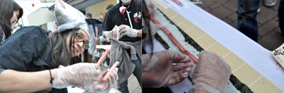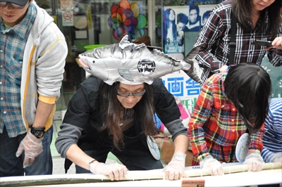 これで鉄火巻きは完成。・・・が、これで終わりではなく、参加者全員で作った鉄火巻きを持ち上げ10秒数えないと記録にならない。