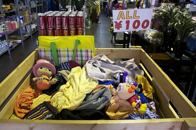 ららぽーと横浜のすぐ近く、都筑区佐江戸町にある店舗へ到着。入店するとまず「ALL¥100」と表示のある木製ワゴンに出くわした。