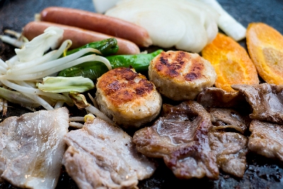 バーベキューは、牛カルビ、豚バラ、ソーセージ、鶏のつくね、タレに漬け込んだラム、そして野菜。シメにヤキソバもつく。