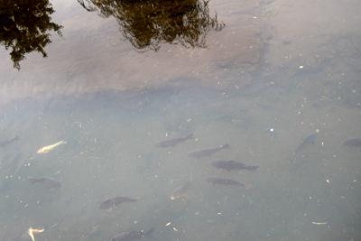 一見、藻ばかり見えて魚がいそうには見えない。諦めかけたころ、今宿団地を過ぎたあたりで見下ろすと、コイの群が悠然と泳いでいた。丸々とサイズも大きく、数十匹はいるだろうか。