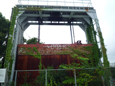 80年近くも前に建てられた水門は、今ではツタを身にまとってしまっている。フェンスに囲まれてはいるが、落書きも。