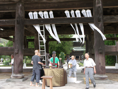 開始20分前、お坊さんや檀家の方が三門の下に祭壇をしつらえていた