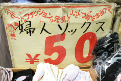 表側は婦人服一色だったが、裏側には、靴下やふきん類などの日用品が並び、どれもが激安価格で販売されている。