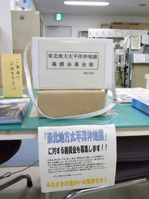 横浜市市民総務課では3月20日現在、被災地への義援金の寄付を、口座振り込みと募金箱で受けつけている。