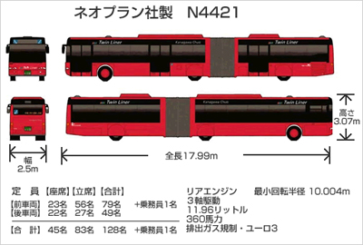 車両は、いくつかの候補の中から、当時ドイツで運行していたネオプラン社製のものを採用。全長17.99メートル、定員129名。これは、東京メトロ丸ノ内線の1車両と、ほぼ同じ長さ・定員なのだという。ちなみに、同社で使用している通常のバスは、定員70名前後のものが多いそうだ。従って、人員にして約倍の輸送量が可能となった。
