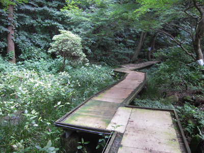 この辺りを「せせらぎの谷」というようだ。「谷」というので滝を連想したが、小さなせせらぎだった。この辺は初夏にはアジサイでにぎわい、鮮やかな水景へと変わるようだ。