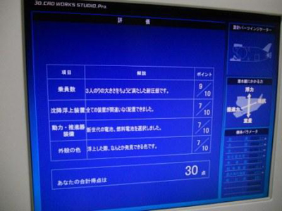 途中で部品を間違えたためか、減点されていた。また外観についての項目は「浮上したときに発見しやすい色を選ぶと良い」とヒントを参考に赤を選んでいたのだが、成績を見ると10点中7点。「なんとか発見できる色です」とあった。何色なら満点だったのだろう……。しかしながら、釈迦堂さん曰く「なかなかの成績ですよ」とのことで平均以下ではないようだ。