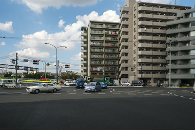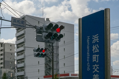 浜松町交差点は国道1号と16号の交差点で、1日に約7万5000台の車が利用している。主要道路同士の交差点なので、一般の交差点に比べて、右左折する車が多い。