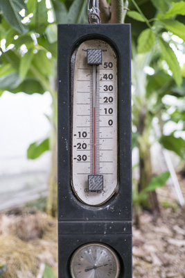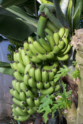 温室のドアを開けるとエキゾチックで爽やかな芳香が流れてくる。そして、目の前にふさふさと青くて小さな実をつけたバナナの木が何本も!