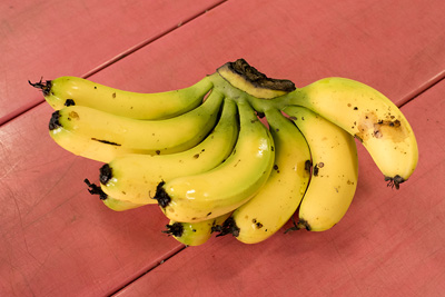 バナナは実ったまま完熟させると皮が縦に裂けてしまう。そのため収穫はバナナの実がまだ青く、縦に走る角が少し丸くなった頃に行う。収穫後の追熟はその時の気温によって変わるが、食べごろになるともつのは2~3日。かなり早めに収穫する輸入ものと違い、ギリギリまで収穫を待つので濃厚な味わいになる。