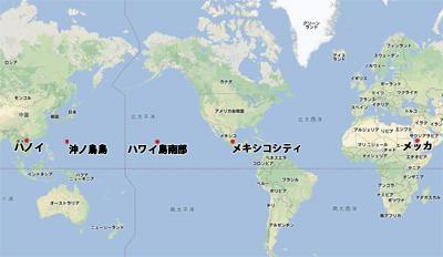 この北緯20度線はおおむね、中国とベトナムの国境近くにあるハノイ、インドのほぼ中央、サウジアラビアのメッカ、メキシコシティ、ハワイ諸島の南部、そして「沖ノ鳥島」を結ぶ位置となる。