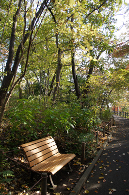 遊歩道にはベンチも。木漏れ日に包まれてのひと休みは心地いい