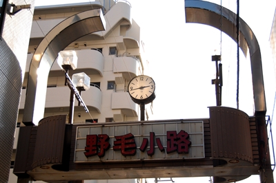 ①アーチ。歩道橋上から野毛小路方面を望む。時計は狂っており、7時2分を指していた