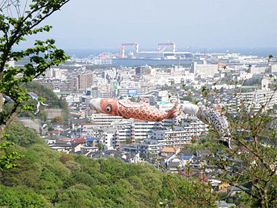 高台からの風景。100匹のこいのぼりが、まさに空を泳ぐ