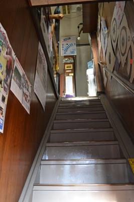警備会社のステッカーが何枚も貼られたビルの隅にある小さな通用門のようなドアに目をやると、そこに「入り口」と書いてある。インターホンを押すと、「どうぞ」という声。ドアを開けるとそこには、普通の民家にあるような狭く急な階段が・・・。