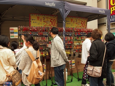 老若男女がワゴンを囲み、ストラップを選んでいる