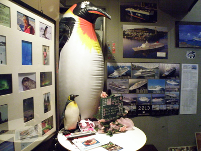 地下へと続く階段を降りていくと、その先に、ペンギンのオブジェや豪華客船の写真などが見えてきた。この階段が南極に向かう航路のように思え、何だか、ワクワクした探検気分が盛り上がってくる。