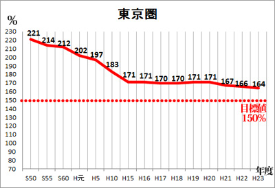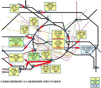 とはいえ、国土交通省は2015年度までに首都圏の全区間の混雑率を180%以内に、主要区間の平均混雑率を150%以内にするという目標を掲げている。