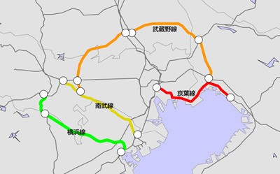 武蔵野線、京葉線、南武線、横浜線を色分けした東京圏地図