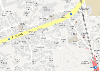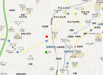 地図を4等分した左上部分の中央あたりに「横浜温泉」を発見