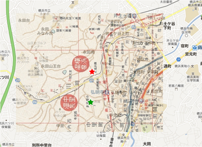 緑色の★で示した場所は「模範大横浜全図」の中里温泉の位置で、現在の地図とピタリと一致した。つまり、この地域には六ツ川と中里に二ヶ所温泉旅館があったということになる。