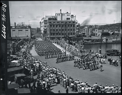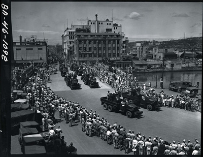 吉田橋の上を行進する米軍のパレードの写真(出典:横浜市史資料室)