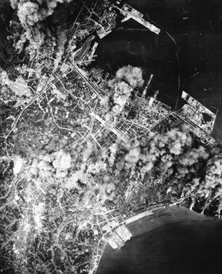 爆撃を受けて炎上する横浜市内(出典:横浜市史資料室)