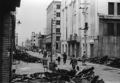 横浜大空襲直後の様子。ガレキに埋もれた伊勢佐木町通り(出典:横浜市史資料室)