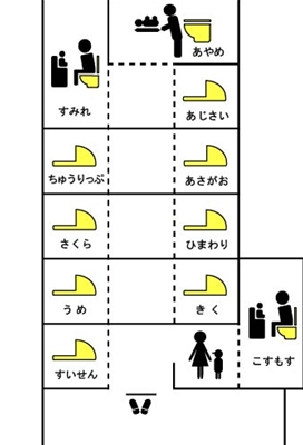 男性用トイレの個室には電車の名前がついているらしい(図は案内板を再現)