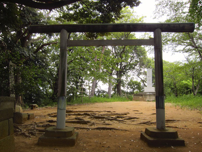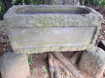 石段101段の上には幅10m×奥行15mほどの空間があり、奥に比較的新しい石碑が立っている。ほかにも狛犬が乗っていたと思われる石の台座や手水鉢らしきものがあり、どちらにも「明治十三年四月」と記されていた。