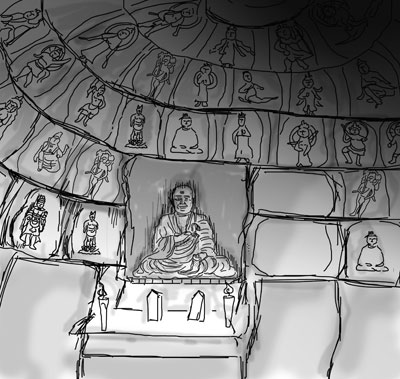 泉が湧く、奥之院。壁には彫刻が施される(再現イラスト:ナリタノゾミ)