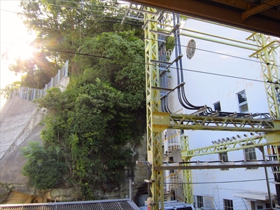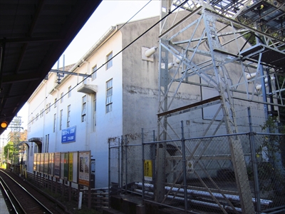 金沢八景駅の上りホーム向かいに戦前建築のにおいがぷんぷんする白いコンクリート製の建物が建っています。出入り口があり得ないくらい高い所についていたり、何の建物なのかきになります(うなぎさんのキニナル)