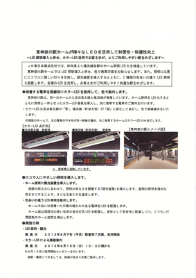東神奈川駅に京浜東北線が来る時は「青」、横浜線は「緑」に点灯するカラーLEDをホーム照明に導入。同駅の効果を検証後、他駅への導入を検討予定
