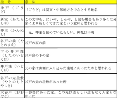 それぞれの屋号の由来については、栄区役所ホームページ「いたちかわらばん」のバックナンバーに載っているので、それをまとめると下の表のようになる。