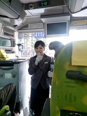運転手の並木基将(もとまさ)さんとバスガイドの郡(こおり)舞さん